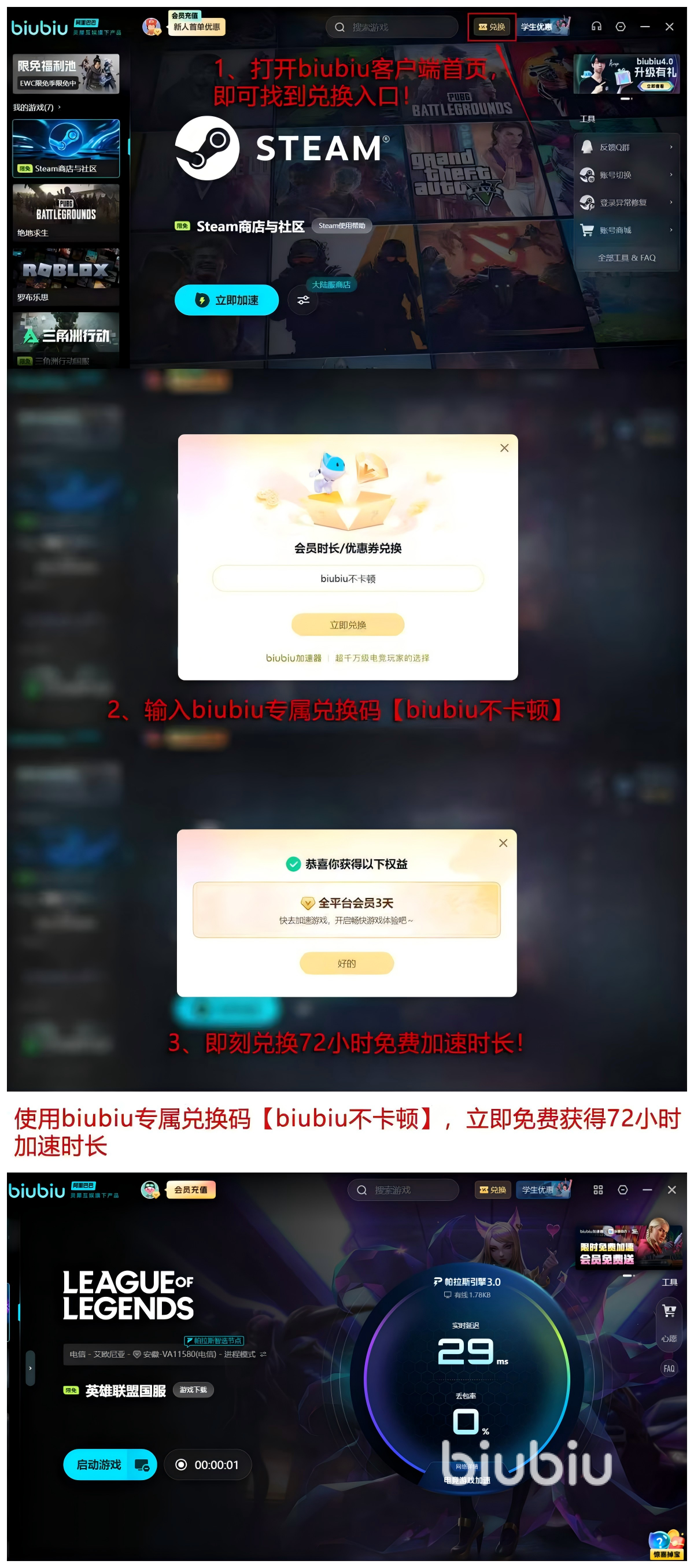 【biubiu不卡顿】口令72小时输入即可领取,新用户注册后自动获得24小时加速时长,叠加口令总计可享96小时免费加速权益,适用于新手入门及短期高强度训练场景。该福利无需绑定支付方式,口令有效期独立计算,未使用时长可长期保留;平台同步开展周期性活动,持续发放额外加速时长。