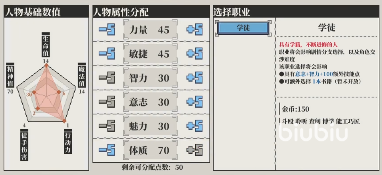 进入人物界面后,左上角显示角色名称、性别与初始职业(仅可选择学徒,后续通过转职任务解锁进阶职业)。左侧六维属性栏分别为:力量(影响物理攻击力)、体质(决定生命值上限与物理防御力)、敏捷(关联攻击速度与闪避率)、魅力(影响NPC互动反馈与好感度变化)、智力(主导魔法攻击力)、意志(反映精神抗性与异常状态抵抗能力)。