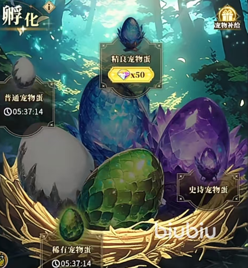 宠物系统入口位于主界面底部城堡图标处,点击即可进入。该功能需满足前置条件——玩家当前所处战区必须已解锁,战区未开放则宠物系统处于锁定状态。系统以“孵蛋”为初始获取方式,不同品质的蛋对应孵化出不同稀有度的宠物;同时支持融合进化机制,低阶宠物可通过合成方式逐步升阶,形成完整的成长链条。