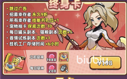 深度付费玩家除必选首充及两大新手礼包外,建议同步开通周卡、月卡与终身卡。周卡提升钞票掉落上限与获取速率,并使挂机收益增加10%;月卡免除广告干扰,每日在常驻卡池享有1次自选招募机会,战斗支持3倍速快进,且经验加速上限提升;终身卡实现广告永久跳过,幸存者招募享9折优惠,宠物抽卡保底次数减少10次,所有幸存者技能书额外增加1个孔位。