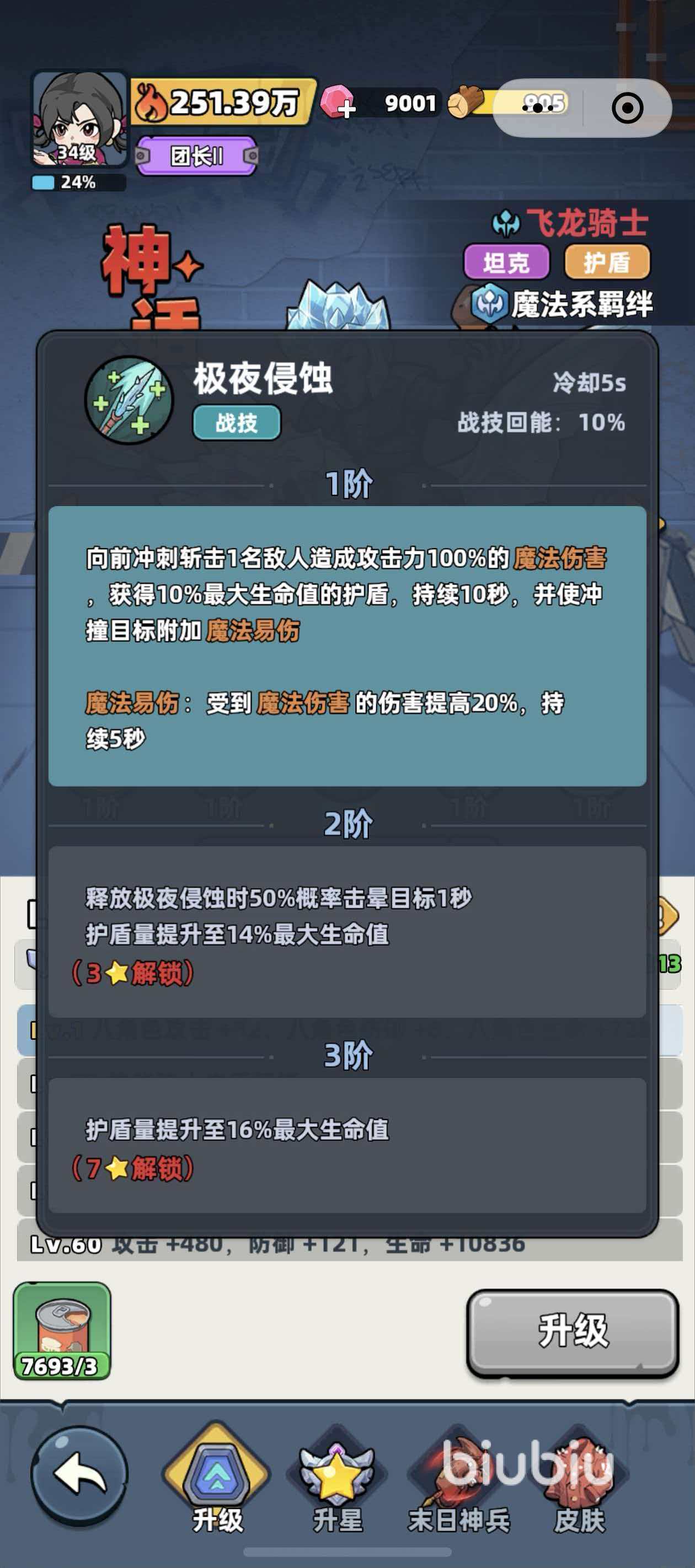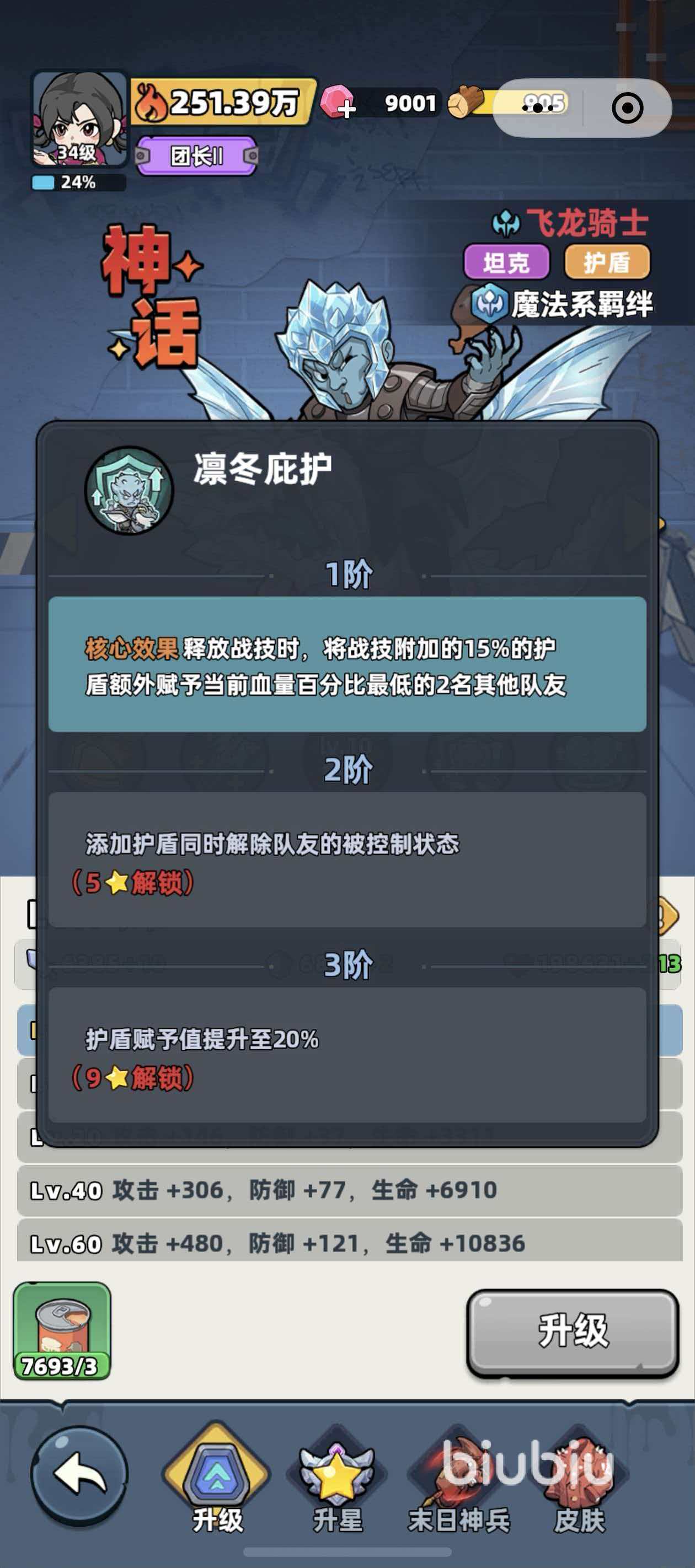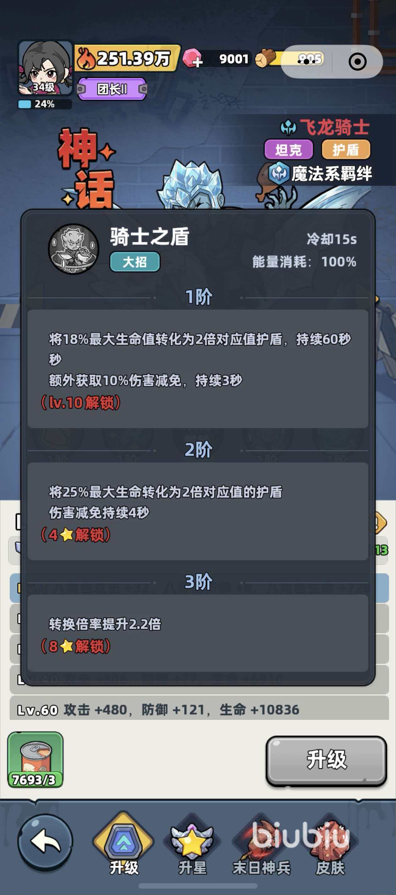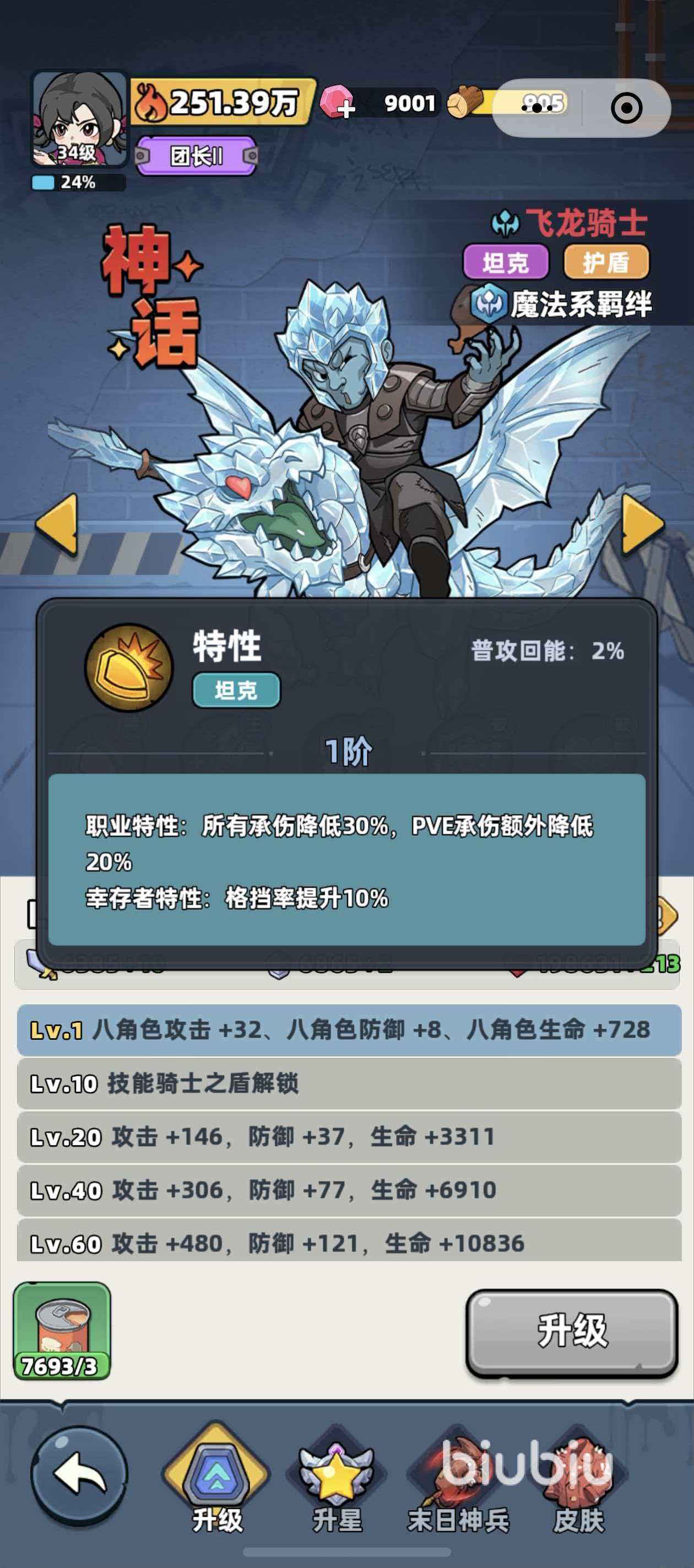 飞龙骑士属于神话品质英雄,职业定位为护盾型坦克,核心羁绊归属魔法系。实战中,该角色可降低自身所受伤害30%,同时登场即提升全队10%格挡率,是前排承伤与团队保护的关键支点。