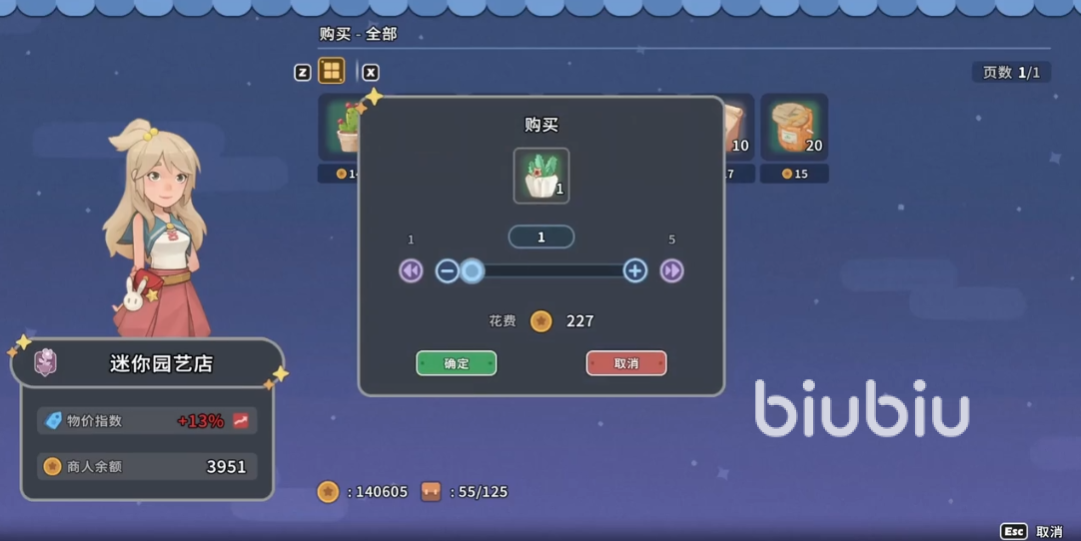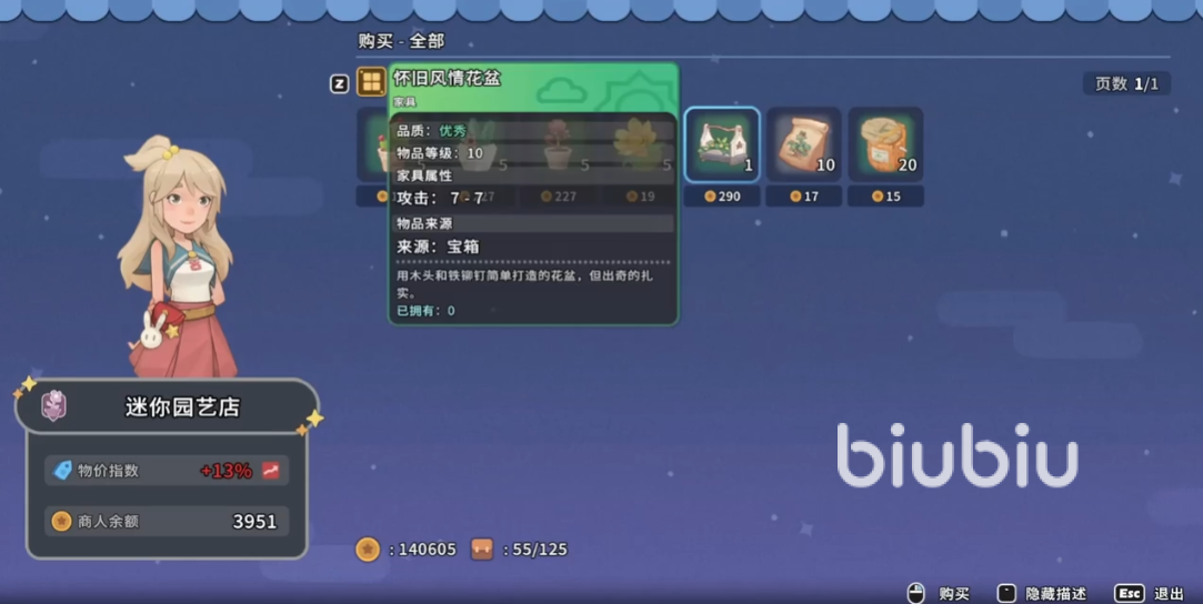 店铺营业时间为每日早7:00至晚22:00,店主尼雅全程驻店。店内主营三类内容:一是基础园艺物资,包括四方铲、浇水壶、施肥器等种植必需工具;二是多品类花卉种子,覆盖初期可种植的全部植物类型;三是土壤改良服务,例如生物结皮土,专用于改善沙地种植条件,提升植被成活率。