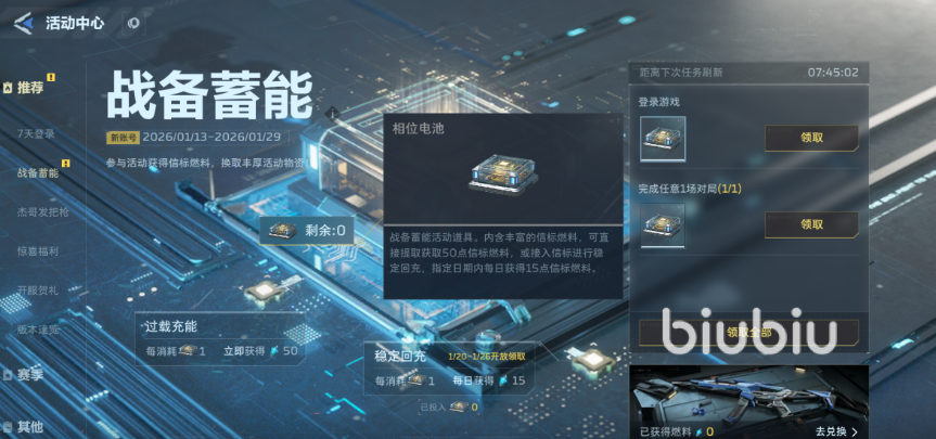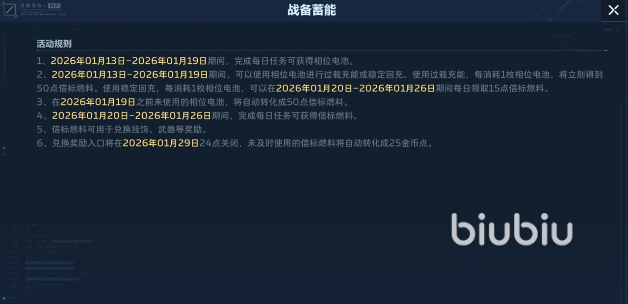 信标燃料是本赛季限定获取的通用兑换货币,主要通过“战备储能”活动产出。该活动开放时间为1月13日至1月29日,期间玩家每日登录并完成任意一场对战,即可领取2个相位电池;每消耗1个相位电池,可稳定获得50点信标燃料。此外,1月20日至1月26日期间还将开启【稳定回充】机制,每日额外消耗1个相位电池,即可再获取15点信标燃料。