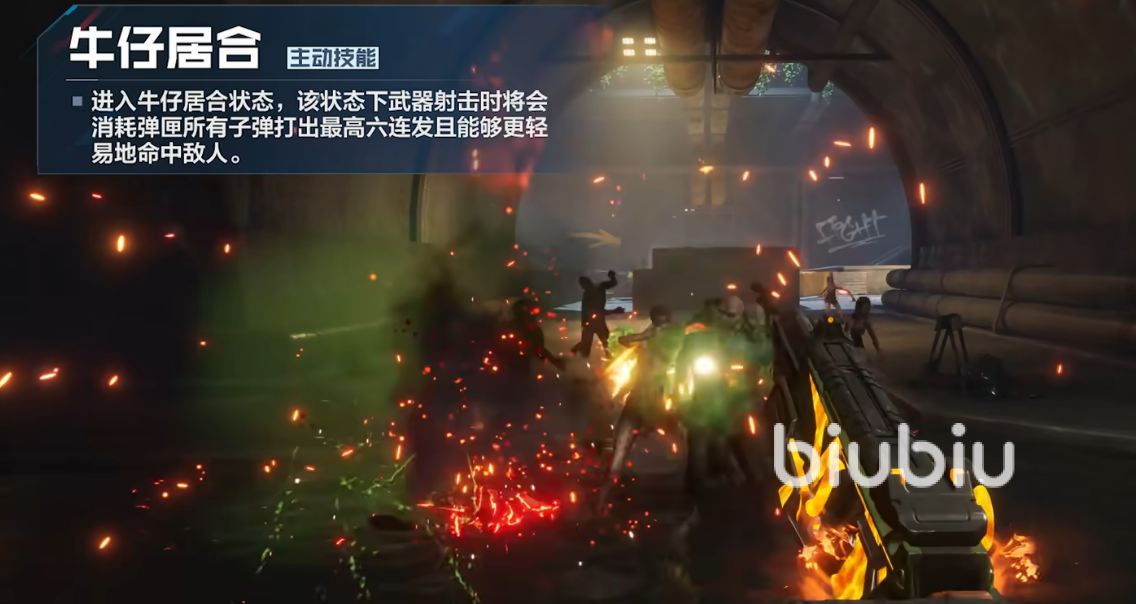该武器的核心主动技能名为“牛仔居合”。开启后,每次扣动扳机即可倾泻当前弹匣全部子弹,最多实现6连发齐射。这一机制显著提升了单位时间内的伤害峰值,在对抗高血量Boss或精英敌人时效果尤为突出。但需注意:技能触发会清空当前弹匣,若未精准预判敌方剩余血量或走位节奏,易导致火力真空期,因此释放时机需结合战场态势谨慎把握。
