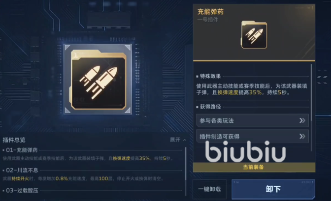 区别于传统射击游戏依赖固定枪械参数的设计,《逆战:未来》引入模块化插件体系,以应对多样化战斗需求。单纯切换主武器难以覆盖所有实战环境,而插件则提供低成本、高适配性的性能补强方案。其中,“充能弹药”为泛用性最强的入门级插件,兼容全部枪械类型,获取门槛低。激活后,当玩家触发主动技能或特定机制时,该插件将自动完成子弹填充,并同步提升换弹速度35%,效果持续5秒。此机制有效规避了传统换弹动作带来的输出真空期,保障火力连续性。