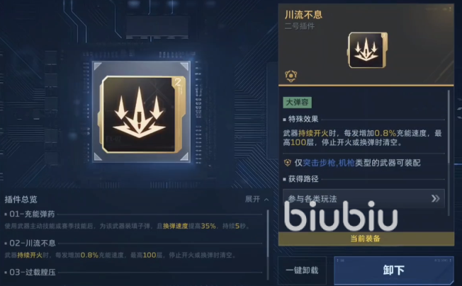 面对高强度近身交火场景,“杀戮连锁”插件可显著增强单次射击的压制潜力——每次开火均有概率额外生成一条独立弹道,实现多线打击。该插件无枪械类型限制,资源获取稳定,适合希望快速弥补火力密度短板的玩家。“川流不息”则侧重能量管理维度,专精于提升枪械充能速率。将其装配于突击步枪或机枪后,在持续射击状态下可逐步叠加充能层数,最高达100层,每层提供0.8点充能加成,从而加快技能循环节奏与核心机制响应效率。
