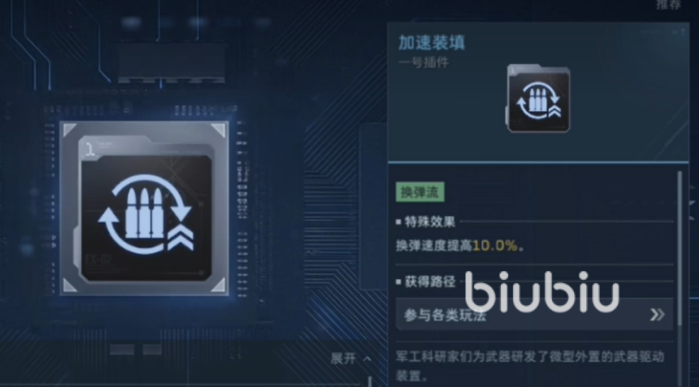 每把可改装武器均配备4个独立插件槽位,支持自由装配。插件按品质划分为蓝、紫、金三级,品质越高,基础属性加成越显著。装配流程简洁直观:进入武器改装界面后,直接拖拽目标插件至对应槽位即可完成安装,无操作门槛。