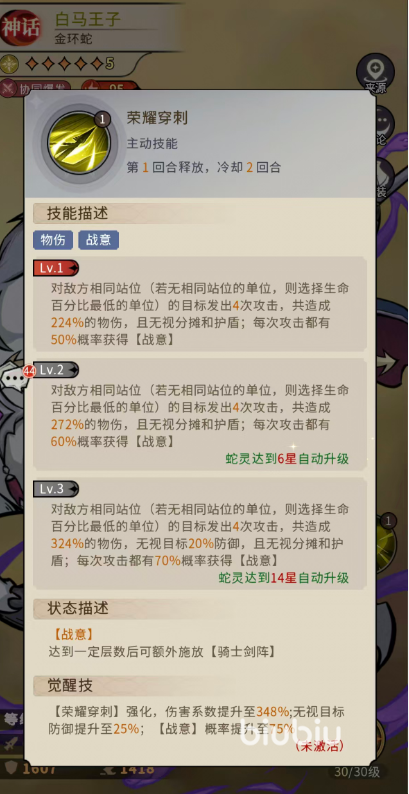 首技能“荣耀穿刺”为白马王子的核心主动技,具备显著的站位响应逻辑:当敌方无同列目标时,自动锁定生命百分比最低单位,发动4段独立攻击,合计造成224%物理伤害,且完全无视护盾与伤害分摊机制;每段攻击均有50%概率赋予【战意】。随着蛇灵星级提升,该技能持续进化——6星时若存在同列敌人,伤害提升至272%,【战意】获取率升至60%;14星时总伤达324%,额外削减目标20%防御,【战意】概率提升至70%;完成觉醒强化后,总伤害跃升至348%,减防效果增强至25%,【战意】触发上限达75%。值得注意的是,【战意】层数直接关联“骑士剑阵”的释放等级与附加效果,构成整套技能循环的中枢变量。