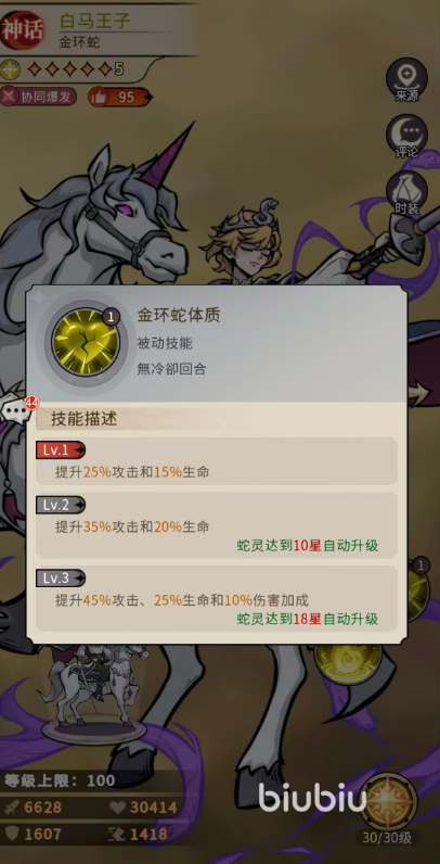 天赋技能“金环蛇体质”提供基础属性支撑:初始生效时提升25%攻击与15%生命;10星解锁后增强至35%攻击、20%生命;18星完全激活时,最终提供45%攻击、25%生命及10%伤害加成。终技“王子披风”为保命反制手段,仅在白马王子生命低于50%时可触发,对敌方全体造成93%物理伤害并立即进入“永恒加冕”状态——该状态下伤害提升15%、暴击率提升5%,所有增益效果均可与天赋叠加;满星强化后,伤害提升至136%,并额外恢复等同于本次伤害值60%的生命量,且每场战斗限触发一次。