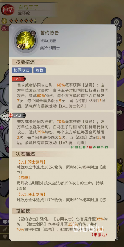 二技能“誓约协击”为被动必杀技,本质是构建团队协同输出网络的关键枢纽。该技能使白马王子在自身普攻或响应队友攻击时,对同一目标追加协同打击:基础形态下,协同攻击造成60%物理伤害,且每次友方蛇灵单位发起攻击均可触发2次(全场每回合上限5次);同时,普攻及协同动作均附带60%【战意】获取率。随星级成长,8星时协同伤害提升至75%,【战意】获取率同步增至70%;16星阶段进一步强化为90%协同伤害,并限定协同对象必须为“相同站位”的敌方单位,此时【战意】满15层即可消耗全部层数,释放三级骑士剑阵,并附带50%概率驱散目标1个增益状态。