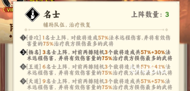 名士阵营的核心优势在于“输出即治疗”的双效循环:单名士上阵时,普攻可造成57%法术远程伤害,并将75%的有效伤害值转化为自身治疗量;当阵容中达到3名士,即可激活基础羁绊,法术伤害提升30%;6名士达成后解锁“王道羁绊”,法术伤害再增42%,同时获得群体治疗与范围输出能力;集齐9名士则触发“天道羁绊”,额外提升57%法术伤害。所有名士武将均通过游戏内常规途径获取,开服即送,无需抽卡或特殊活动兑换。
