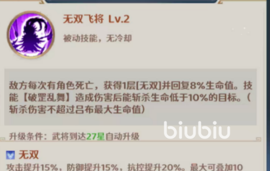 吕布的核心技能具备显著战术价值:“破罡乱舞”可对全体敌方单位造成100%物理伤害,并附带治疗削减效果,适用于敌方密集阵型的快速压制;“无双飞将”则提供可持续强化机制——每次击杀敌方单位后获得1层无双状态,最多叠加至5层,每层提升8%最大生命值回复、15%攻击力或15%防御力,显著增强其续航与输出稳定性。