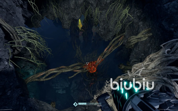 藤蔓焚尽后,洞口显露为灰白色枯萎藤蔓结构,可作为安全落点缓冲层。玩家既可攀附下降,也可直接跃入;若担心坠落风险,推荐启用喷气推进器进行姿态校正与减速控制。需特别注意:洞口仅在星球处于黑夜阶段保持开放,一旦星球进入“复苏”状态(表现为地表温度显著回落至非灼热水平,同时伴随明显尘土扬起现象),无论外部光照是否仍为暗色,洞穴都将不可逆关闭。此时必须立即撤离,延迟将导致被困。