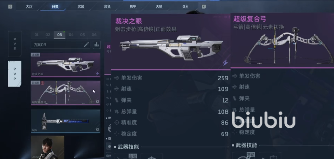 主武器推荐使用“裁决之眼”。该武器在机甲战场景中具备显著性能优势,其主动技能可同步提升暴击率或暴击伤害,使单发子弹命中即具威胁。当暴击成功触发后,还将额外赋予攻击速度加成,形成“暴击→加速→再暴击”的正向循环,整体输出呈指数级跃升,足以有效穿透机甲厚重装甲。副武器建议搭配“超级复合弓”,该弓在裁决之眼主动技能激活状态下可获得协同增益,二者技能联动后可进一步放大总伤害量。