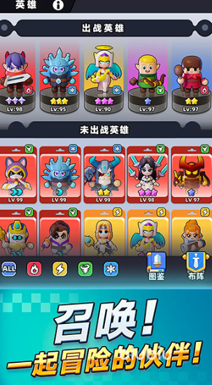 操作设计强调轻量化与适配性,支持全场景快速上手。竖屏界面结合全自动战斗系统,英雄将自主完成普攻与技能释放,玩家仅需专注阵容搭配与技能释放时机选择,单指即可完成全部操作,体验流畅割草感。每局时长控制在5至10分钟,契合碎片化时间安排,适合通勤、午休等短时段娱乐。技能特效风格魔性鲜明,背景音乐节奏强劲,兼具解压效果与沉浸感。角色建模采用Q版卡通风格,融合暗黑地牢主题与呆萌动态表现,整体视觉呈现如动画剧集般生动吸睛。