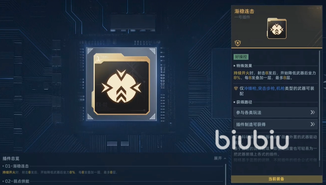 插件配置直接影响实战表现。首插件位推荐装配“渐稳连击”,虽不提升直接伤害,但可有效抑制后坐力波动,提升连续射击稳定性,同时缩短主动技能后的换弹时间;第二插件位适配“超频蓄能”,提供50%充能速率加成,显著压缩技能冷却周期;若侧重弱点打击流派,“技能循环弱点”亦为优选,每次命中弱点均可返还部分技能能量。副武器建议选用超级复合弓,开启技能后可获得30%射速加成,有效弥补幽冥毒王射速偏缓的短板。