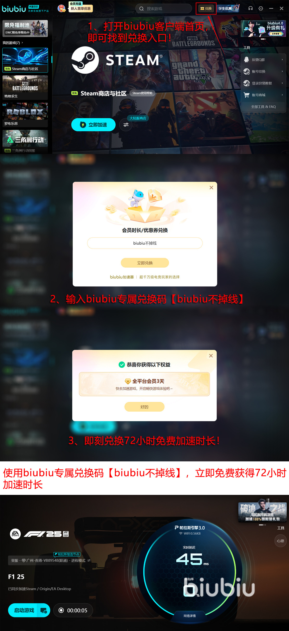 当前新用户专享福利已上线:输入口令 【biubiu不掉线】 即可领取三天免费加速时长;完成注册后额外获赠24小时,累计可用时长达96小时,支持多网络环境切换测试,全面验证实际加速效果。