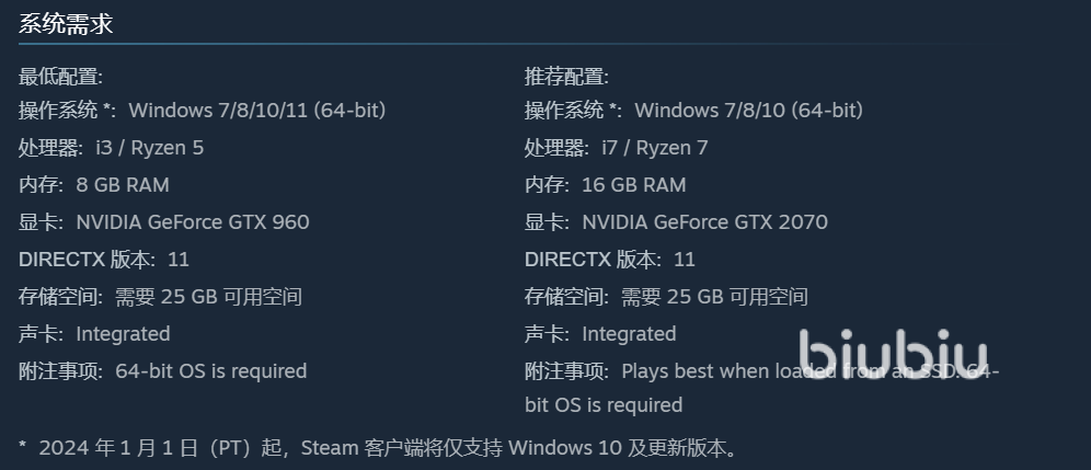 基础运行配置要求:操作系统需为64位Windows 7、Windows 8、Windows 10或Windows 11;处理器最低须配备Intel Core i3系列;内存不得低于8GB RAM,以保障地图加载、病原体演化逻辑及UI响应的稳定性;显卡需达到NVIDIA GeForce GTX 960级别,方可支持基础光影渲染与动态天气系统;安装空间至少预留25GB,适用于SSD或HDD硬盘。