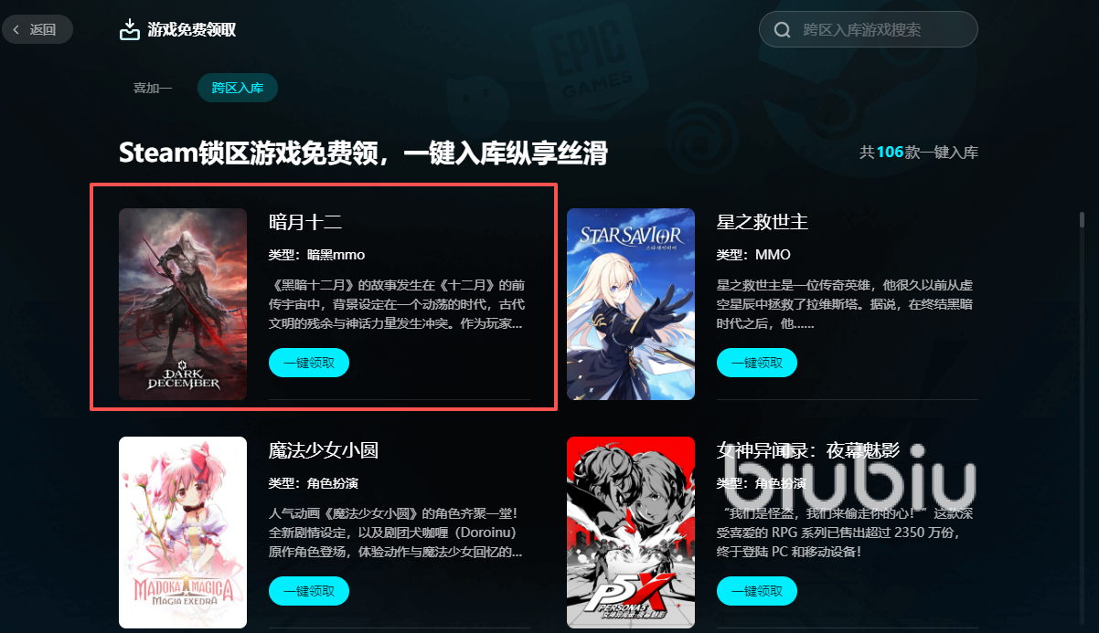 暗月十二锁区了也没有关系,大家先去修改Steam账号地区,然后来biubiu这里找到跨区入库选项,就能一键领取这个新游了。这个好办法分享给好友们也是不错的选择,这样大伙就能一起轻松得到它,开始组队升级畅快玩了。