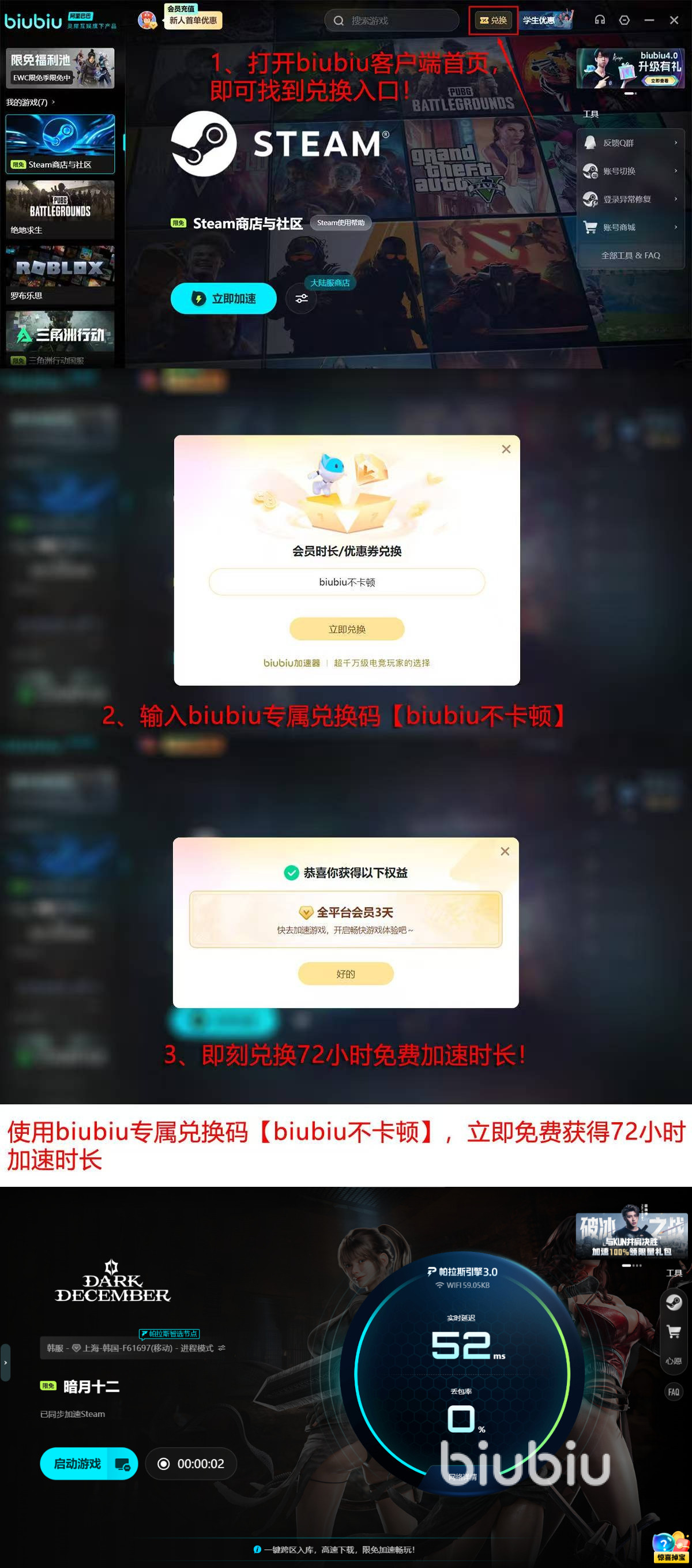 此刻,biubiu正开启新人激励计划,诚意满满:注册即赠24小时无门槛尊享加速,输入【biubiu不卡顿】更可继续多轮深渊挑战72小时,累计96小时的免费特权,足以支撑你和队友完成多轮高强度团战演练。