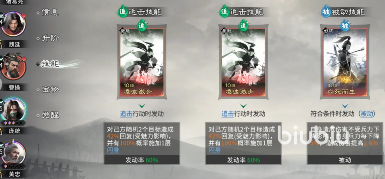 技能搭配上,庞统推荐携带【凌波微步】与【相思而生】。前者提供闪避能力,有效规避关键伤害,后者可将其主动技转化为追击技,配合双追击类技能卡,大幅提升出手次数与生存空间。被动效果亦能防止兵力衰减,维持战力稳定输出。