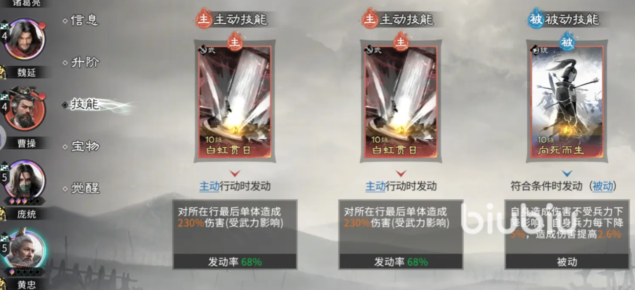 黄忠技能组合建议选用【白虹贯日】与【向死而生】。前者强化单体爆发,后者可在低血量时激活高额增伤,配合双主动技能卡配置,进一步放大残血反杀能力。其定位始终为辅助型输出,依赖庞统提供的连环环境实现伤害扩散。