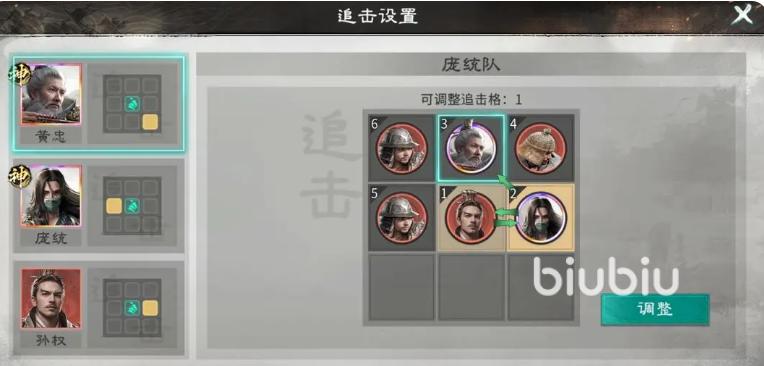 值得注意的是,庞统具备重生机制。一旦被击败,可立即触发觉醒,获得15%全属性增伤及20点智力提升,并重置连环计释放机会。这一特性使其在中后期拥有极强的容错率与爆发续航能力。为最大化追击频率,阵容后排应配置两名双穿杨军,用以填补物理穿透缺口;站位方面,黄忠无需占据追击格,而庞统必须踩中孙权的追击格,同时其位置也需覆盖黄忠的追击格,确保三者间追击链完整闭环。当武将达到鎏金品质后,三人追击触发频率将显著提高,进一步强化连环计的循环效率。
