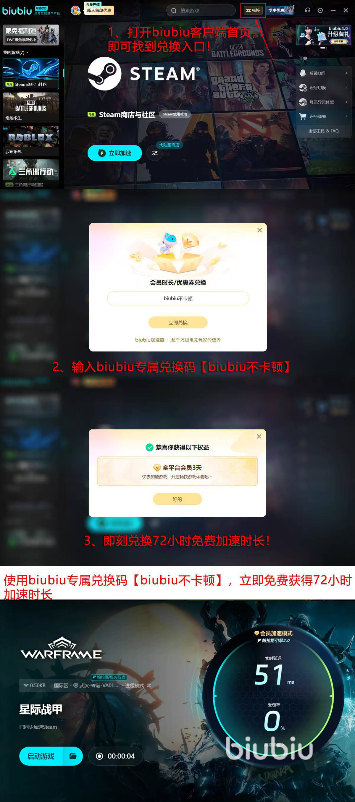 目前,新用户注册即可获赠24小时全游戏加速时长(系统自动发放),另可通过客户端首页“兑换”弹窗输入口令【biubiu不卡顿】领取额外72小时,两项权益可叠加,总计享96小时免费体验。整个流程耗时不足3分钟:下载安装约2分钟,账号注册与激活约40秒。相比更换路由器、升级千兆宽带或购置高端显卡等高成本方案,biubiu提供了一种高效、低成本、零硬件门槛的稳定性提升路径,尤其适合追求竞技公平性与操作流畅度的核心玩家。