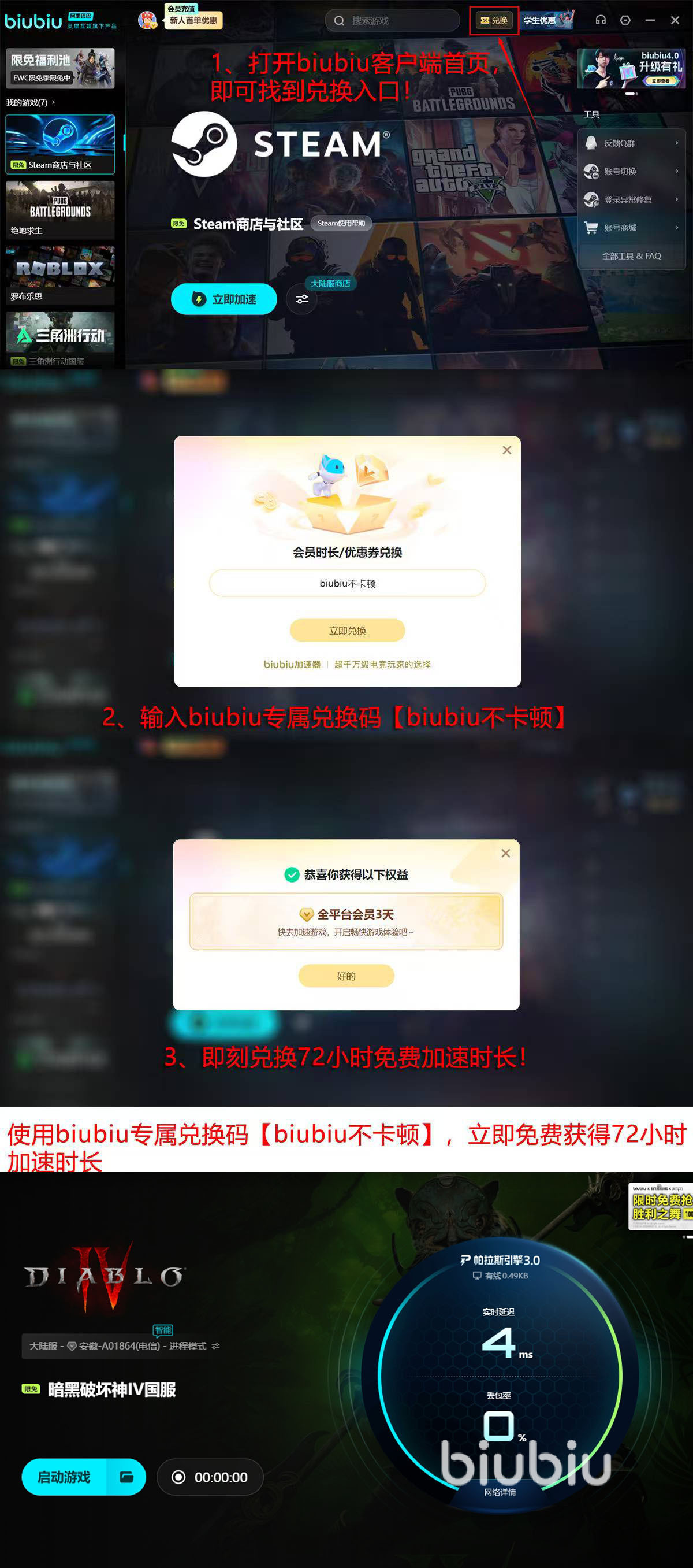 对于当前受网络问题困扰的《暗黑破坏神4》玩家,建议立即尝试biubiu加速器。安装流程仅需三分钟:注册账号即可获赠24小时新手体验时长;完成注册后,进入客户端首页点击“兑换”,输入口令【biubiu不卡顿】,还可额外领取72小时加速时长。两项权益可叠加使用,总计享96小时免费加速服务。