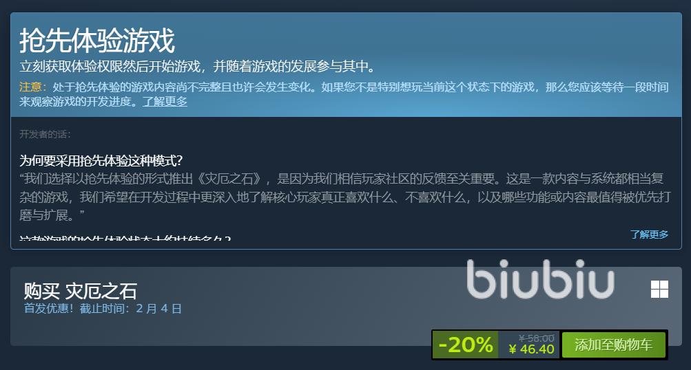 目前,《灾厄之石》处于Steam抢先体验阶段,标准售价为58元人民币。首发期间限时享受八折优惠,折后价为46.4元。该折扣有效期至2月4日,此后将恢复原价,有意入手的玩家需留意时间节点。