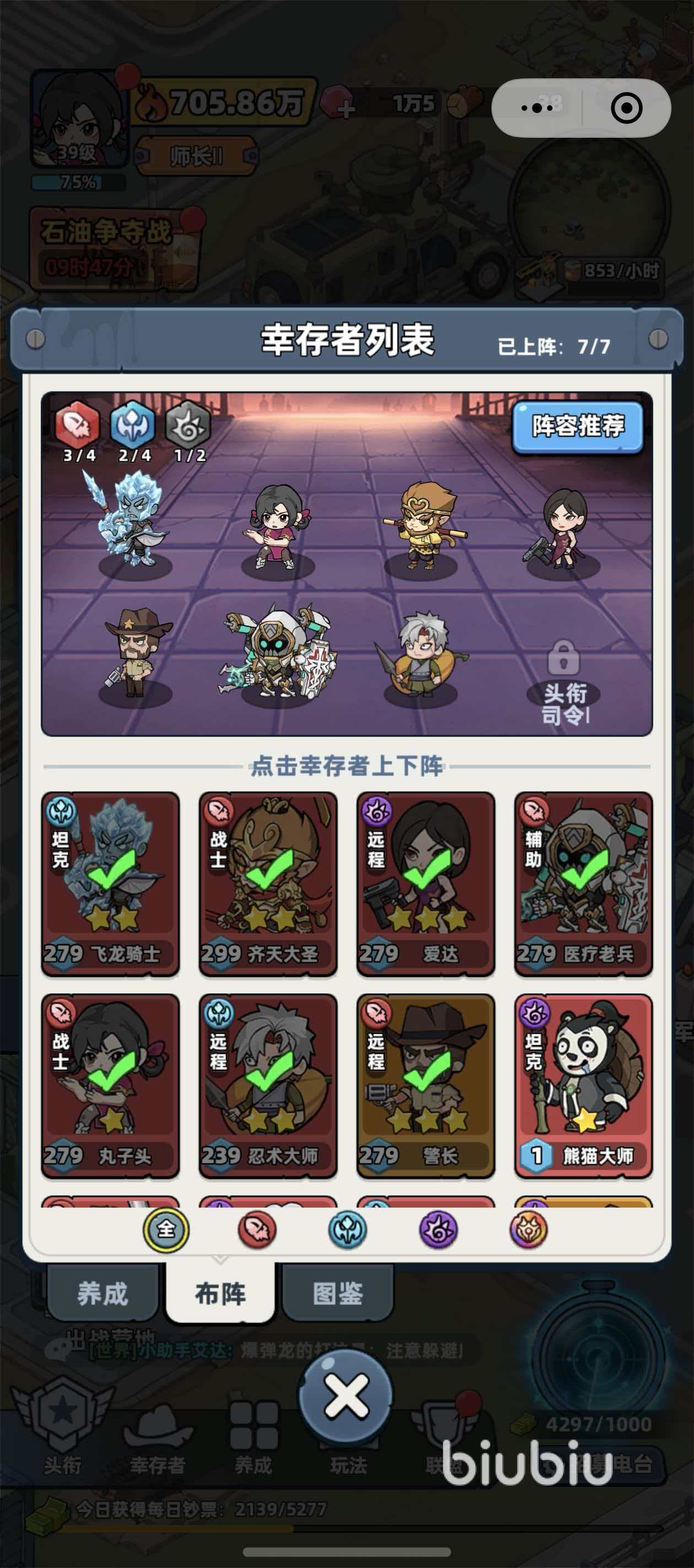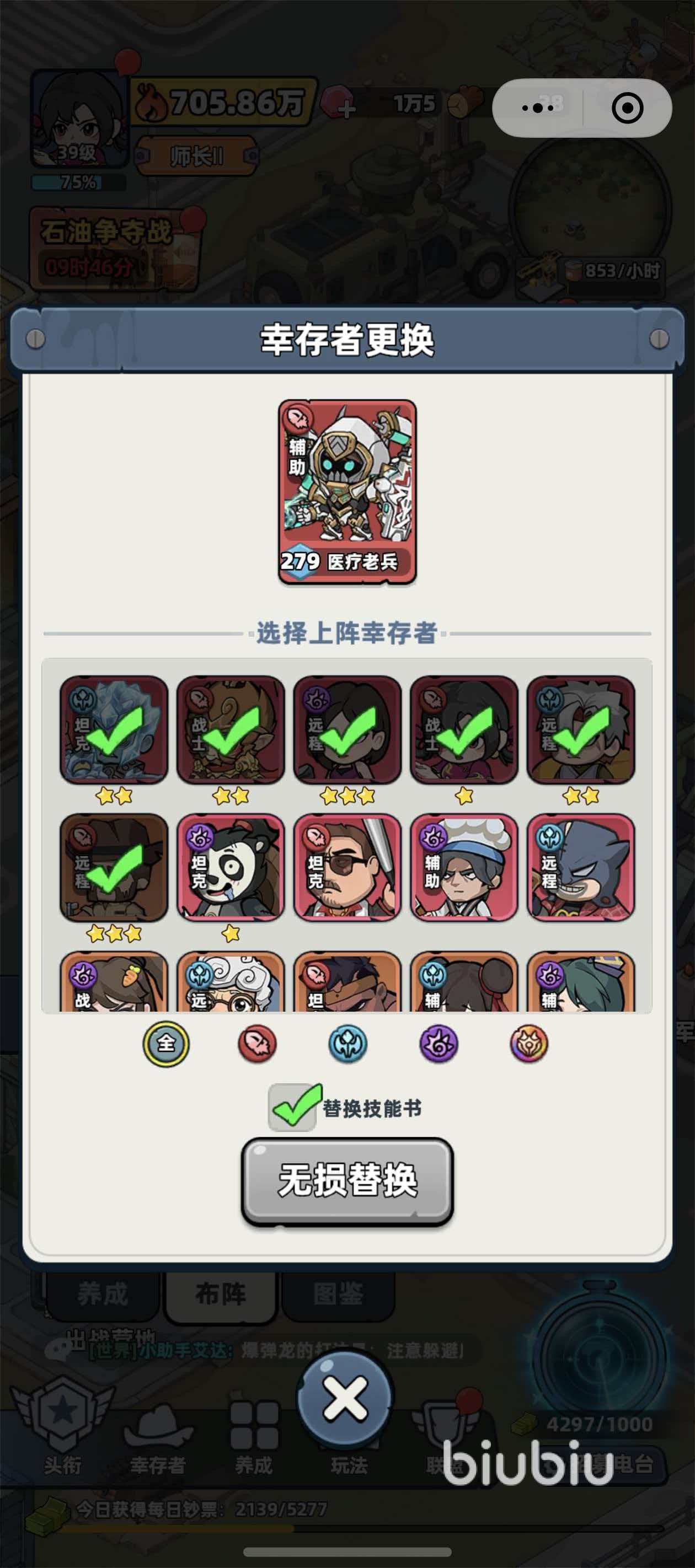 角色更换流程极为直观:进入游戏后,点击屏幕底部【幸存者】入口,即可查看已获取的全部角色列表。在列表页底部,设有【养成】【布阵】【图鉴】三个功能标签,此时需切换至【布阵】界面。在当前编队中,点击任一已上阵角色(例如医疗老兵),系统将自动跳转至该位置的角色替换面板。在此界面下方滚动浏览可选幸存者,点击目标角色即可完成无损替换。特别注意:务必勾选“同步更换技能书”选项,避免替换后手动重新配置技能,节省养成时间并保障战力无缝衔接。