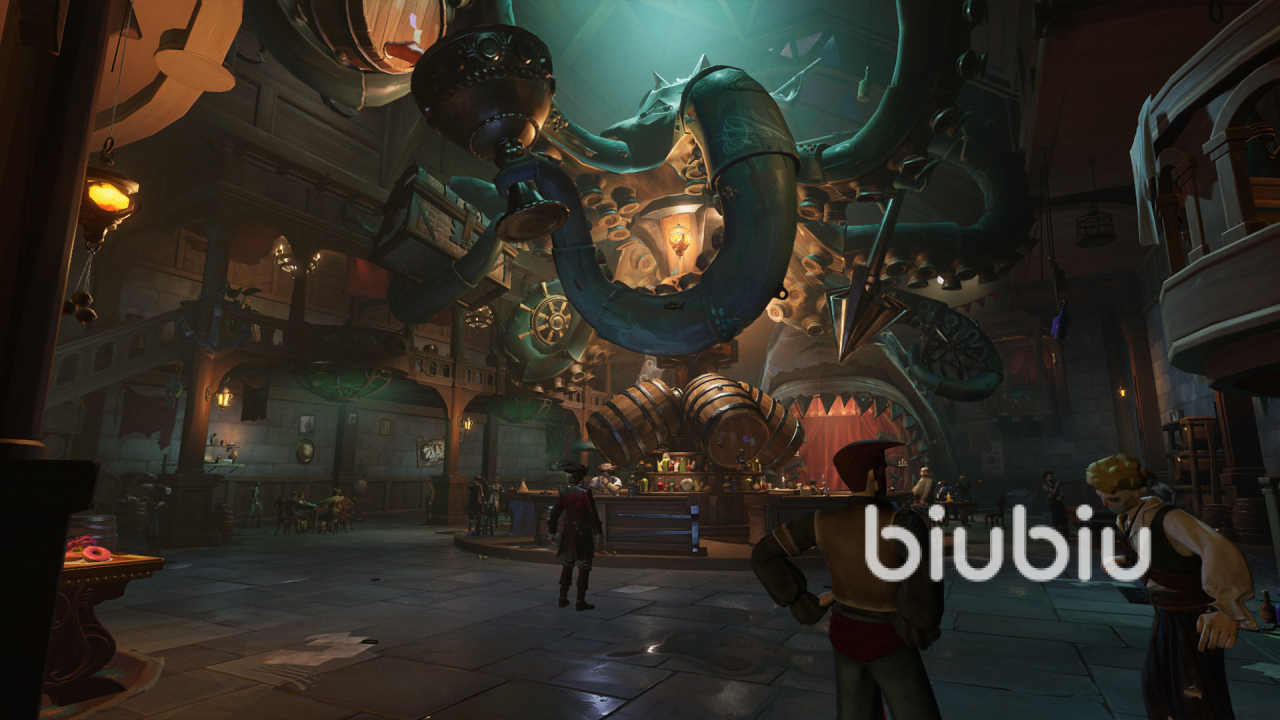 该风格不仅贯穿角色建模,更延伸至全地图场景构建。从锈蚀齿轮驱动的港口吊塔,到布满关节铆钉的浮空岛屿,再到由木质骨架支撑的幽暗海底遗迹,每一处环境皆严格遵循木偶朋克的材质逻辑与比例法则,强化沉浸式叙事张力。