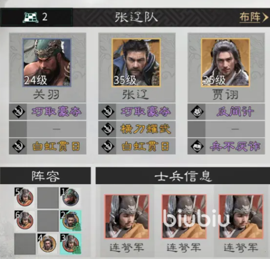 推荐两套经实战验证的高效阵容:第一套为关羽、张辽、贾诩组合。关羽与张辽均携带“巧取豪夺”,实现双技能覆盖,极大提升控场成功率;第二套为张辽、张飞、许褚配置。其中张辽与许褚同样装备“巧取豪夺”,保障控制连续性;张飞则选用“单枪匹马”与“白虹贯日”,强化追击伤害;张辽站位前排中央,可高效触发张飞与许褚的追击联动,实现高频输出压制。后排部署三支连弩军单位,提供稳定远程火力,加速战斗终结进程。