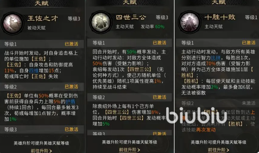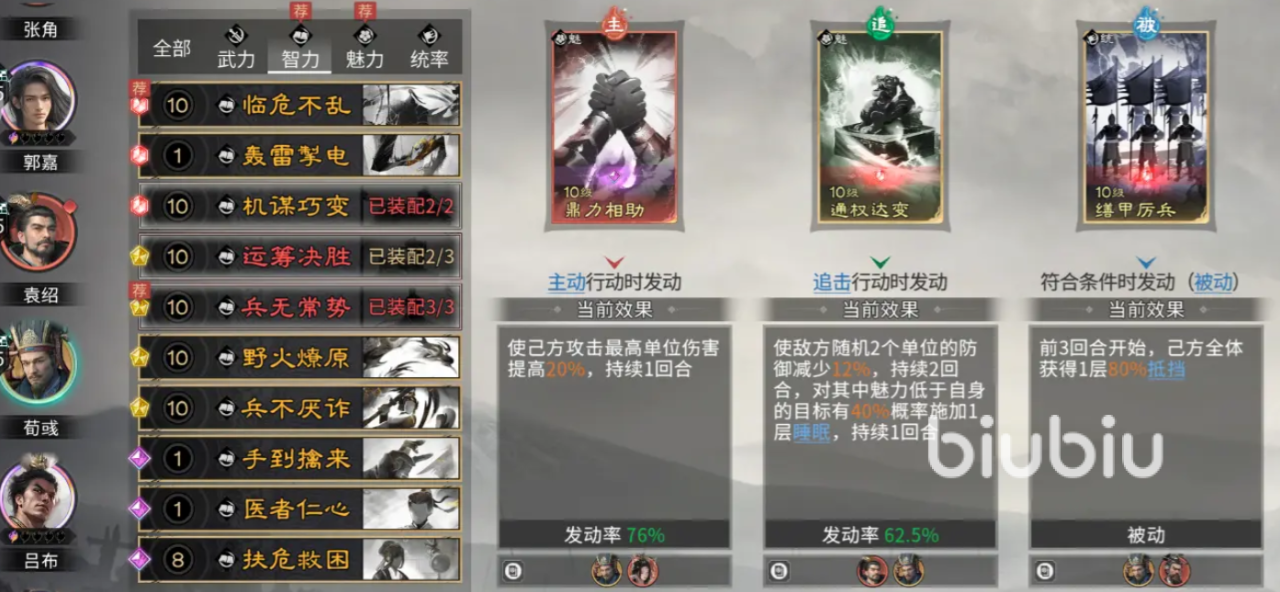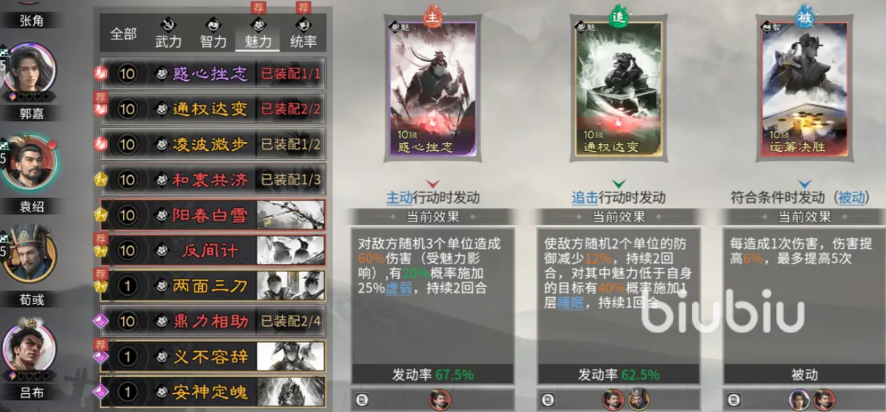 袁绍自带天赋“四世三公”具备初始群体伤害能力,配合荀彧增益后,可显著放大郭嘉“十胜十败”的天赋发动率,从而提升全队技能覆盖率。其技能搭配推荐【惑心挫志】【通权达变】【运筹决胜】:前两者强化群体压制与状态施加(如虚弱),后者则直接提升天赋触发次数,并附带睡眠控制概率;首次受击时还可获得额外属性成长,进一步巩固续航优势。
