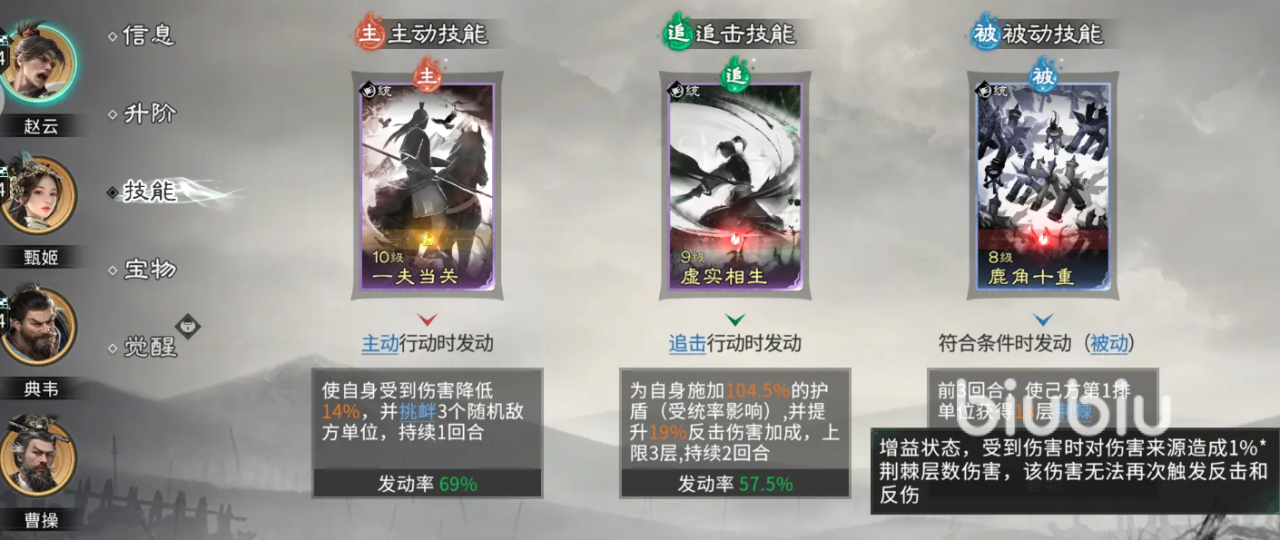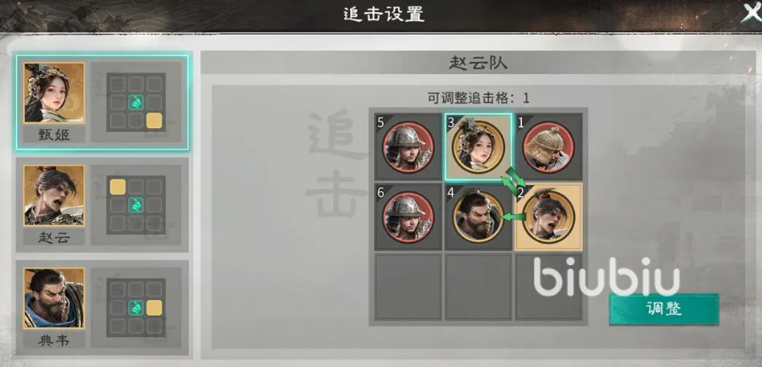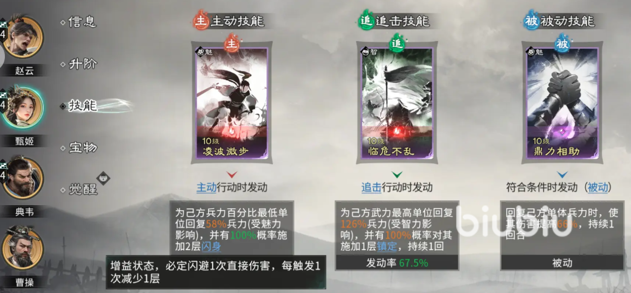 典韦在此体系中承担前排承伤与战术联动双重职能。其天赋“折冲左右”不仅能为赵云提供减伤保护,更可在受击时概率触发反击状态,成为全队反击循环的关键启动点。甄姬则通过天赋为赵云提供兵力回复,并在赵云闪避率提升后,进一步激活其右上格追击延伸效果;当甄姬自身位于赵云追击格范围内时,亦可同步触发追击技能,形成双向响应。