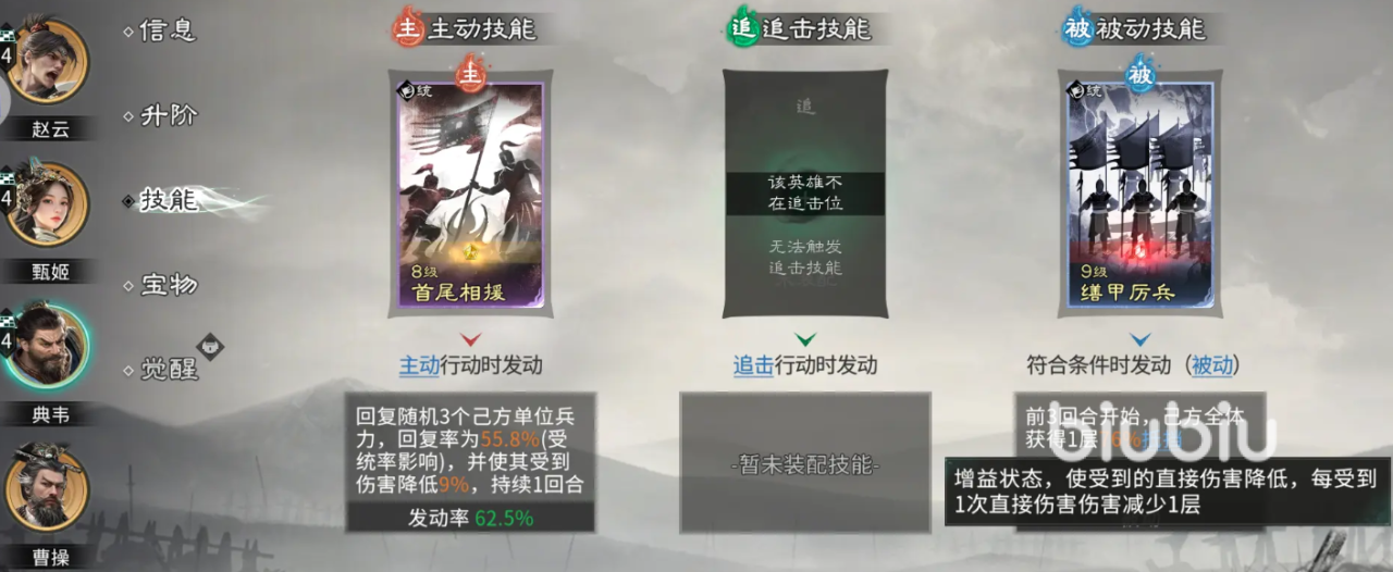 典韦作为前排主力,技能推荐“首尾相援”,可为我方三名单位恢复兵力,在群体续航层面发挥关键作用,特别适配赵云这类依赖反击频率打输出的武将。由于典韦通常无法进入追击格,因此无需配置追击类技能。整套阵容以赵云为反击核心,对单核高爆发型对手(如吕布、张辽)压制有限,但在对抗多核或中低强度阵容时,往往能保持较低战损率,具备较强泛用性。
