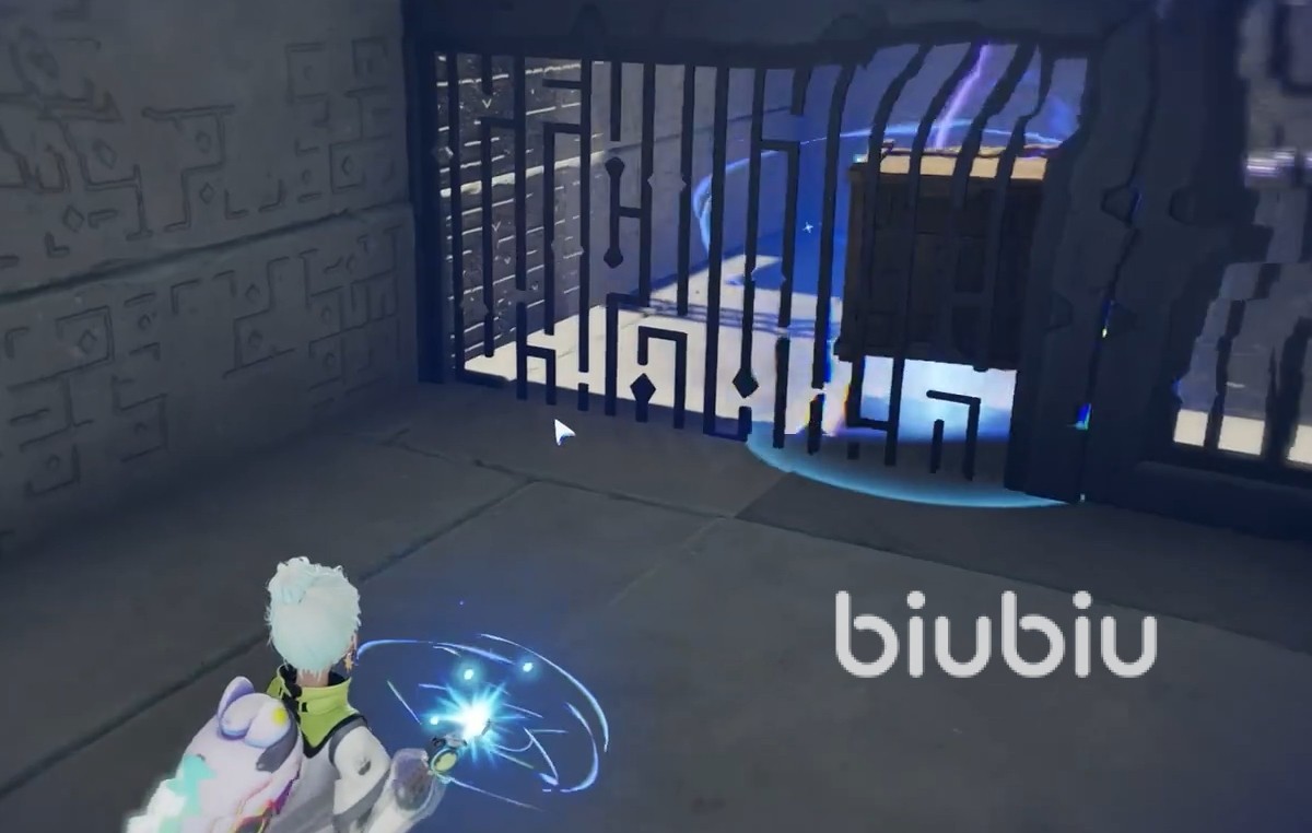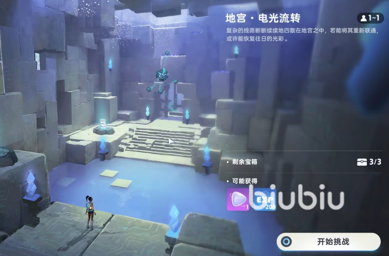 该地宫坐落于闪电之森正下方。初始区域中央可见一条中断的导电线路,两端为裸露的电路节点,中间被一只木箱阻隔。此时需操控场景旁的紫色电箱,将其推动撞击木箱使其移位,随后将电箱精准嵌入两节点之间,完成通路闭环。此时前方闸门自动开启,通往第二关。首个宝箱即藏于该紫色电箱后方固定位置。