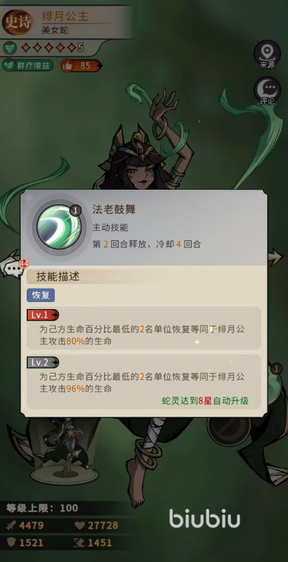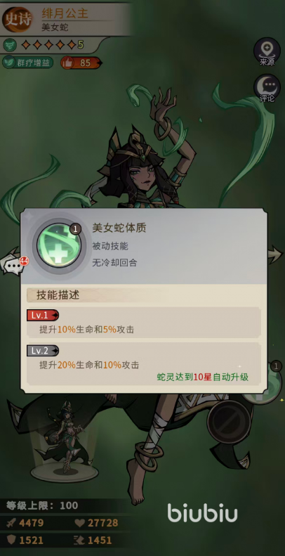 被动天赋“美女蛇体质”提供基础属性成长:初始生效时增加10%最大生命值与5%攻击力;升至十星后,提升至20%生命值与10%攻击力加成。其中生命值增幅显著强化其战场存活能力,降低被集火秒杀风险。技能释放节奏方面,必须严格遵循“先开艳后蜜语”的操作逻辑——所有后续治疗与输出效果均依赖该技能所附带的增益状态,唯有前置叠层,才能激活完整数值转化链条。