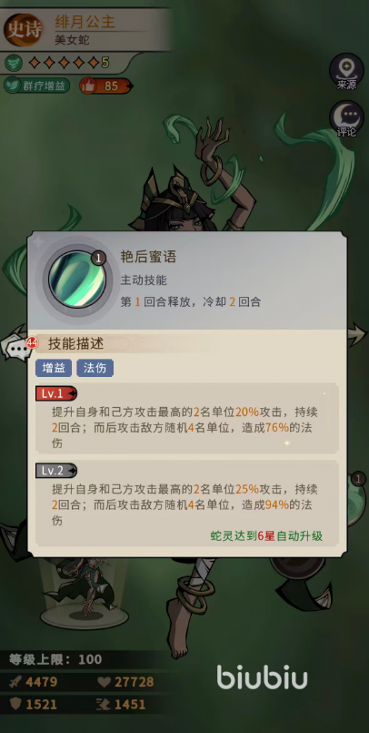 核心技能“艳后蜜语”为开局即用的复合型技能:释放后立即为自身及场上攻击属性最高的两名友方单位施加持续增益,提供20%攻击力提升;同时锁定四个随机敌方目标,造成76%法术伤害。该技能存在机制联动——增益效果与群体伤害同步触发,因此优先释放可快速积攒能量,并为后续技能衔接奠定基础。当绯月公主升至六星时,增益幅度提升至25%攻击力,群体法伤增至94%。值得注意的是,该技能在技能等级达到3级后,伤害数值将受暴击率与法术穿透属性影响;因此中后期需关注其生存环境,避免开场被敌方高机动性蛇灵突袭秒杀。建议搭配具备护盾、嘲讽或减伤能力的前排蛇灵,形成有效保护链。
