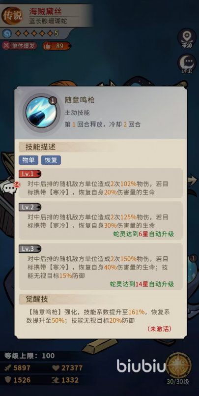 一技能【随意鸣枪】为物理伤害型主动技,初始可对中后排随机一名敌方单位发动两次攻击,每次造成102%物理伤害。若目标处于寒冷状态,则海贼黛丝可恢复相当于本次总伤害20%的生命值。升至6星后,单次伤害提升至125%,吸血比例同步增至30%;达到14星时,单次伤害进一步强化至150%,吸血比例达40%,并额外附加无视目标15%防御的效果。该机制不仅保障了她在中后期的生存能力,更显著提升了对低抗性脆皮单位的瞬杀效率。