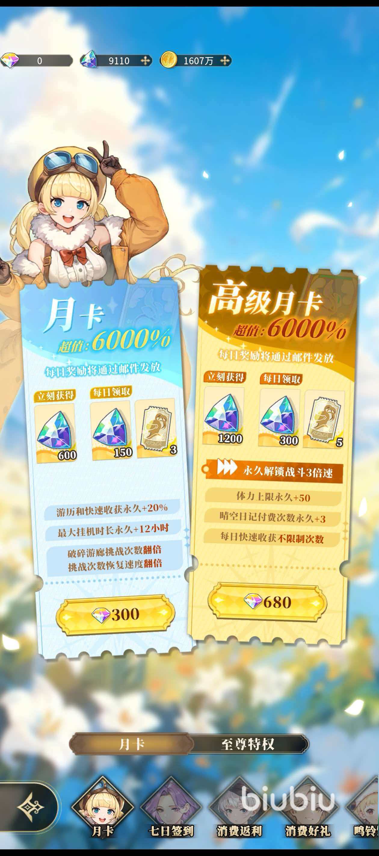分为标准月卡(30元)与高级月卡(60元)两种档位。开通后,梅泰诺游历与快速收获效率永久提升20%,挂机市场收益时长永久增加12小时,挑战次数翻倍;高级月卡额外提供永久3倍快速战斗权限、体力上限+50、晴空日记付费次数+3、每日快速收获无次数限制。若进一步激活至尊特权,还可获得战斗次数刷新+5、风暴之源最高成绩扫荡权限、竞技大会快速挑战资格、寻星奖章+2、自动选卡功能等专属权益。