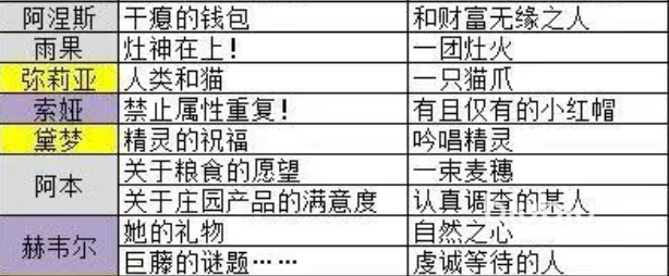 其余角色线索与身份对应关系如下: 【阿涅斯】——“干瘪的钱包”,身份为“和财富无缘之人”; 【雨果】——“灶神在上”,身份为“一团灶火”; 【弥莉亚】——“人类和猫”,身份为“一只猫爪”; 【索娅】——“禁止属性重复”,身份为“有且仅有的小红帽”; 【黛梦】——“得精灵的祝福”,身份为“吟唱精灵”; 【阿本】——“关于粮食的愿望”,身份为“一束麦穗”;“关于庄园产品的满意度”,身份为“认真调查的某人”; 【赫韦尔】——“他的礼物”,身份为“自然之心”;“巨藤的谜题”,身份为“虔诚等待的人”。