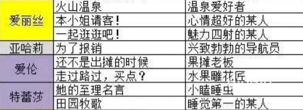 【爱丽丝】——“火山温泉”,身份为“温泉爱好者”;“本小姐请客”,身份为“心情超好的某人”;“一起逛逛吧”,身份为“魅力四射的某人”; 【亚哈莉】——“为了报销”,身份为“兴致勃勃的导航员”; 【爱伦】——“还不是出摊的时候”,身份为“果摊老板”;“走过路过,买点”,身份为“水果雕花酱”; 【特蕾莎】——“他的至理名言”,身份为“小瞌睡虫”;“田园牧歌”,身份为“睡觉第一的某人”; 【玛洛莉】——“怦然心动”,身份为“艺术的烟花”; 【菲妮丝】——“秘密观察”,身份为“女神大人的信徒”; 【格丽特儿】——“冒险者采访”,身份为“镜中采访者”。