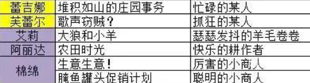 【蕾吉纳】——“堆积如山的庄园事物”,身份为“忙碌的某人”; 【芙蕾尔】——“歌声窃贼”,身份为“抓狂的某人”; 【艾莉】——“大狼和小羊”,身份为“瑟瑟发抖的羊毛卷卷”; 【阿丽达】——“农田时光”,身份为“快乐的耕作者”; 【绵绵】——“生意生意”,身份为“厉害的小商人”;“腌鱼罐头促销计划”,身份为“聪明的小商人”。