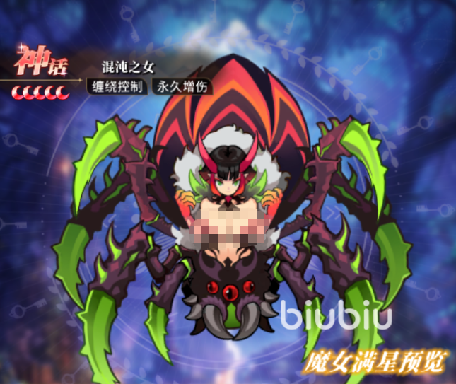 混沌之女擅长多目标持续压制与状态叠加。其核心技能持续10秒,初始即可对最多7名敌人造成9000%总伤害,并每5秒额外锁定3名新目标进行输出。若在缠绕期间成功击败被控敌人,全队获得一层“嗜血”状态,使混沌之女伤害提升4%;该效果最高可叠加至20层,且叠满后永久保留全部增益,形成越战越强的滚雪球机制。