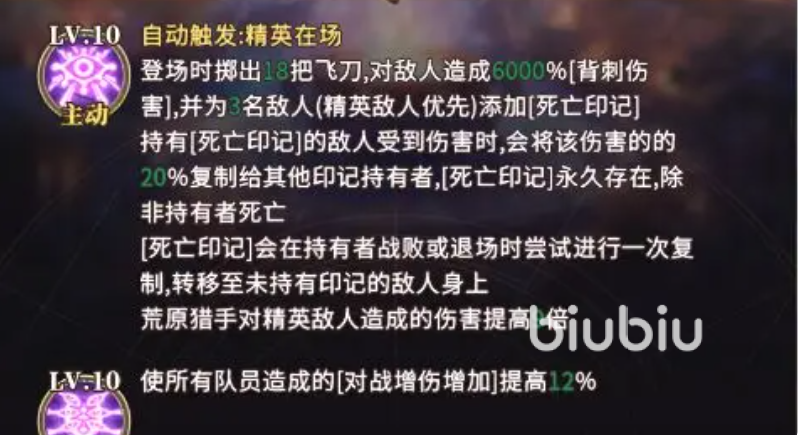 被动技能为团队增益型效果,在战斗开始时即生效:荒原猎手在场时,我方全体角色对战伤害提升12%。这一加成与主动技能形成协同,使其在面对Boss或多个精英单位组成的高难度关卡时表现尤为突出——既能叠加伤害,又能实现跨目标传导,大幅压缩敌方生存窗口。