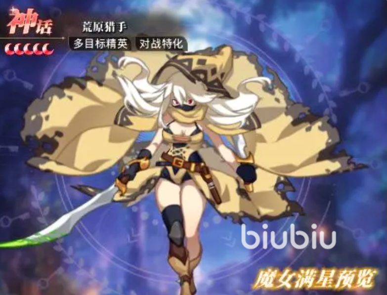 该角色无法通过普通召唤获取,必须进入游戏内“魔女系统”,消耗咒语书进行限定抽取。作为高阶输出单位,荒原猎手的核心机制围绕精英野怪展开——其主动技能具备自动触发特性:当战场出现精英敌人时,立即投掷18把飞刀,造成总计6000%的穿刺伤害,并对其中3名精英目标施加“死亡印记”。