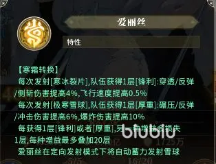 特性一【寒霜转换】构成其战术中枢:释放寒冰裂片时,全队获得「锋利」状态(叠加上限20层),每层提升穿透伤害、返弹伤害、侧斩伤害各4%,并增加0.5%飞行速度;释放极寒雪球时,则施加「厚重」状态(同样最高20层),使碾压伤害、返弹伤害、冲击伤害提升6%,爆炸伤害提升10%。需注意——锋利与厚重互斥,任一状态新增1层,另一状态即减少1层,该机制要求玩家根据关卡类型精准切换输出模式。