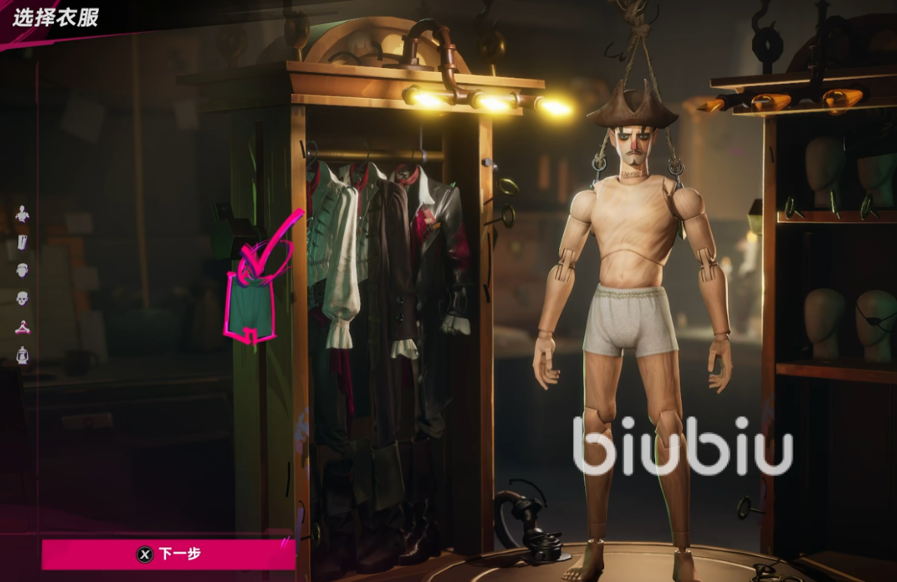 若希望不依赖充值完成初始造型设定,可在创建角色阶段直接配置时装。完成面部定制后,进入衣柜系统,从预设款式中任选其一:如经典海盗风套装、破旧西装造型、简约白衬衫风格,亦可选择极简方案——仅保留基础木偶躯干并搭配单件内裤外观。所有选项均支持即时预览与确认,满足多样化审美需求。