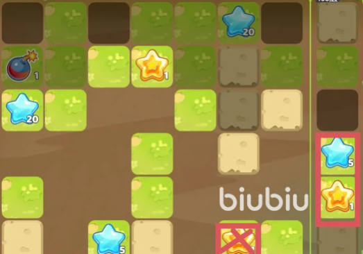 道具使用讲究时机与位置。炸弹与火箭均为限时道具,不可跨期保留,须在当期活动内全部用完。横向火箭适用于整行障碍清除,常能实现“一换多”的连锁收益;炸弹建议优先用于清除石头与宝箱,既可打通路径,又能顺带拾取隐藏道具。所有道具均需拖拽至空地释放,例如地图右侧开阔区域,精准布放可显著降低铲子消耗。